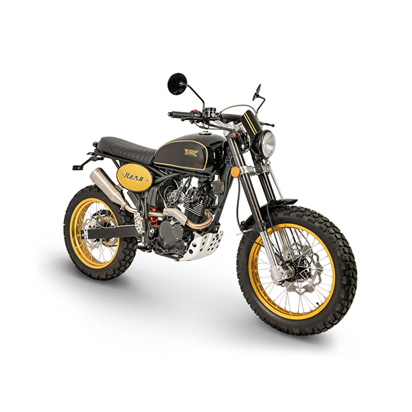De adventure scrambler en bestseller van Bluroc. Nieuwe exclusieve Goud-Zwart kleur en technische verbeteringen. Solo of met passagier te rijden, met lange-slag instelbare hydraulische vering voor alle wegen, ook de minder verharde.